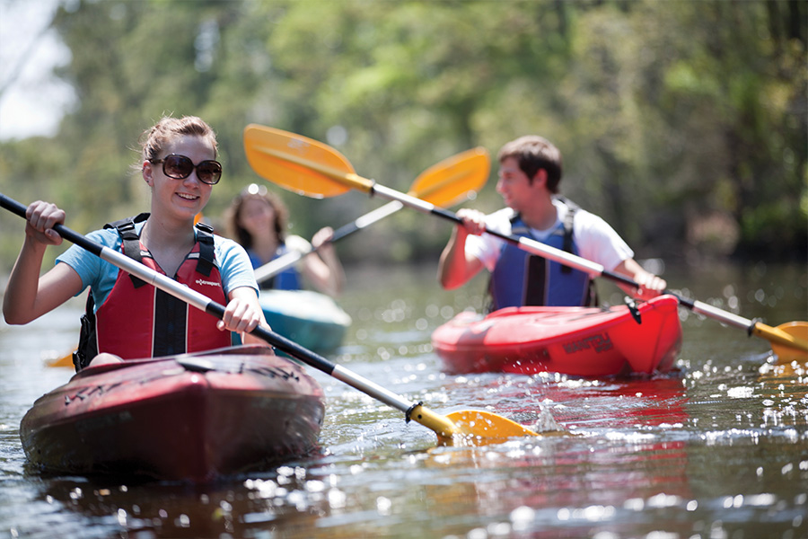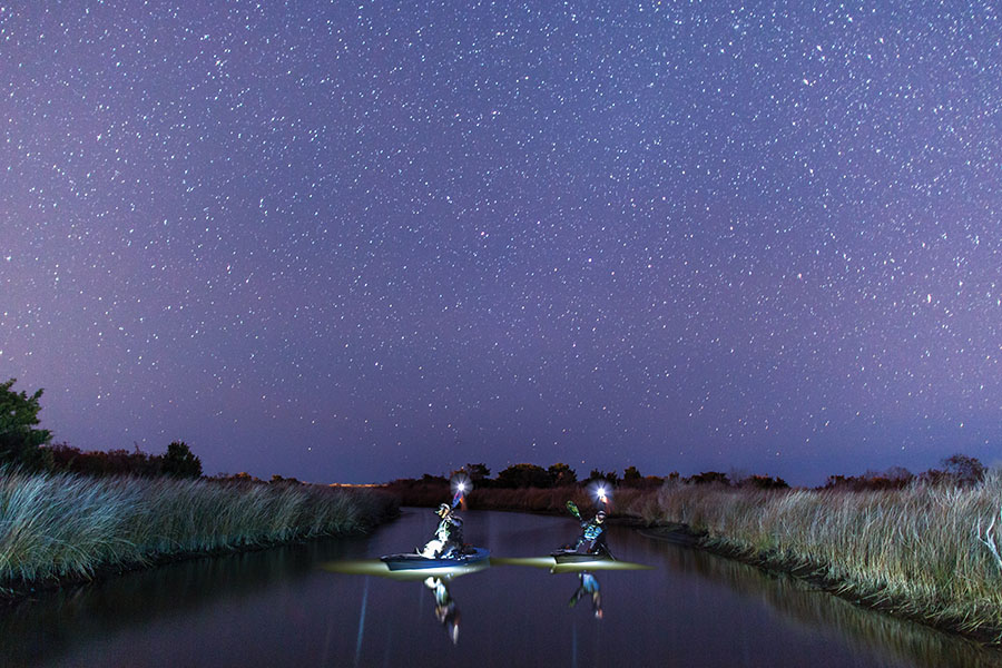 The sounds are tailor-made for watersports like kayaking and stand-up paddleboarding, which are best in calmer waters, especially around marsh edges and creeks where wildlife is active and the scenery feels untouched. For a really relaxing paddle, you can canoe in the waterways of Alligator River National Wildlife Refuge on the mainland, and maybe even see an alligator or a bear. Then there’s the high-energy side of soundside watersports: personal watercraft aka Jet Skiing, wakeboarding, waterskiing and tubing.