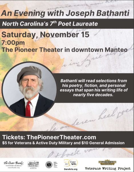 Experience a special evening of poetry with North Carolina’s 7th Poet Laureate Joseph Bathanti. Join us as he shares selections from his poetry, fiction, and personal essays that span his writing life of nearly five decades as part of OBX's Veterans Week. Q & A will follow.