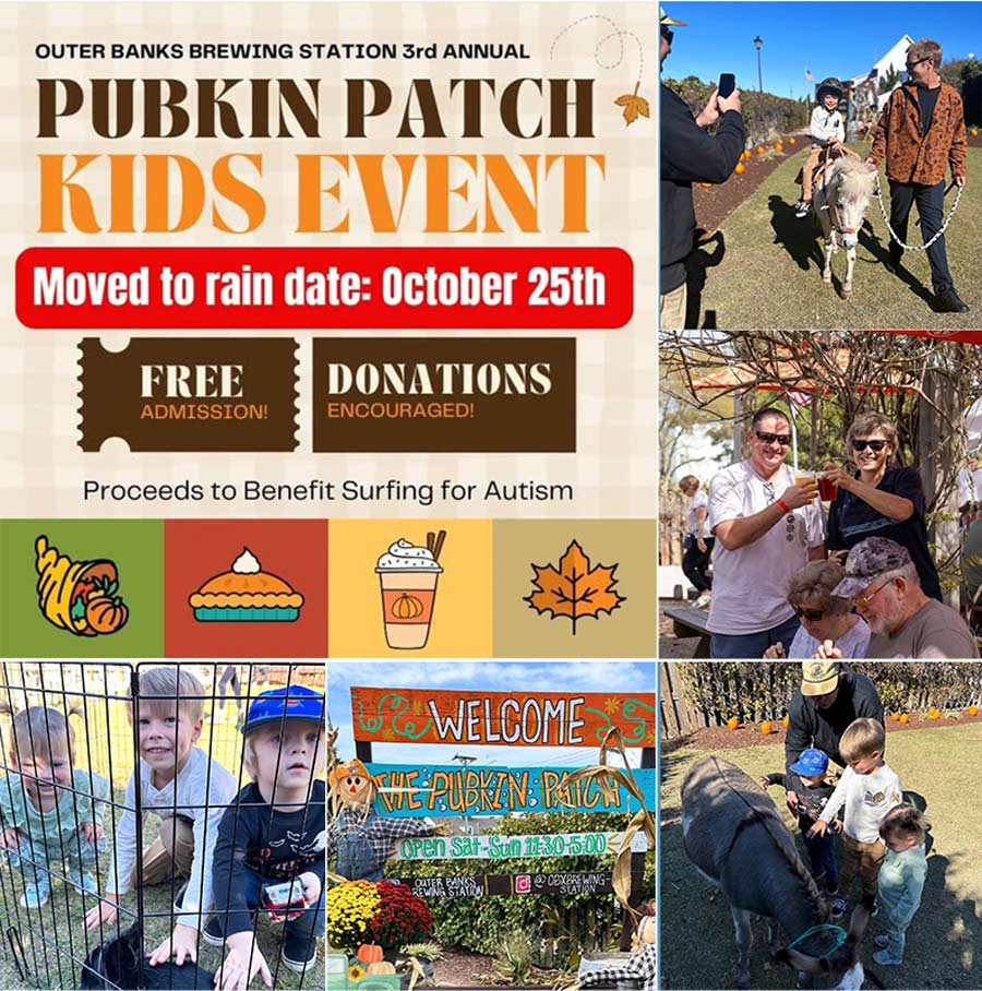 On Saturday it's kids' day at Outer Banks Brewing Station with the Pubkin Patch Kids' Event from 12 to 3 p.m. This afternoon of family fun features a petting zoo, pony rides, pumpkin painting, a bounce house, balloon animals, face painting and fall-themed food and drink specials. Proceeds benefit Surfing for Autism, so your pumpkins and playtime support a great cause.