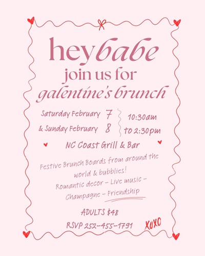 Galentine’s Brunch at NC Coast Grill & Bar – February 8, 10:30 a.m. to 2 p.m. – Enjoy brunch with your girls while noshing on brunch boards and bubbly. Cost is $48 per person. Reserve by text: 252-455-1791