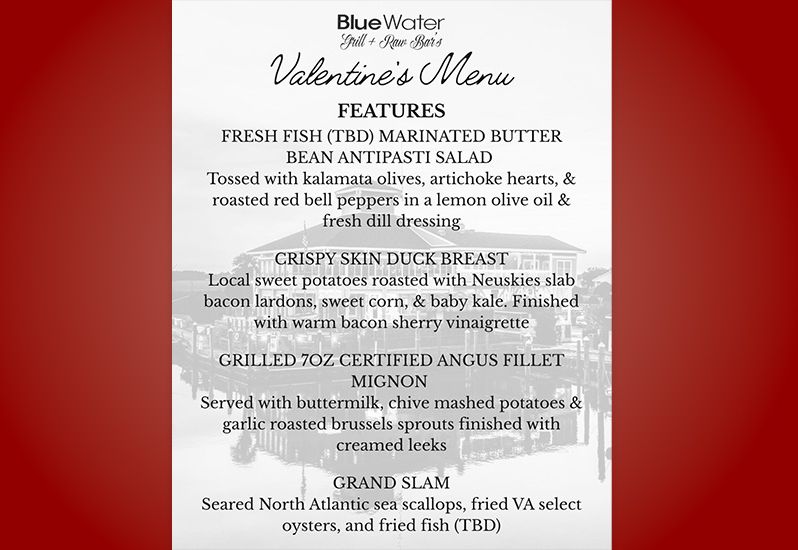 Enjoy a special Valentine’s Day dinner at Blue Water Grill & Raw Bar in Pirate’s Cove, featuring a holiday menu crafted for the occasion. ❤️ Savor soup and salad specials, new appetizers, decadent desserts, and featured entrées thoughtfully curated for a memorable evening. Grab your someone special and dine waterfront for a romantic Outer Banks experience.