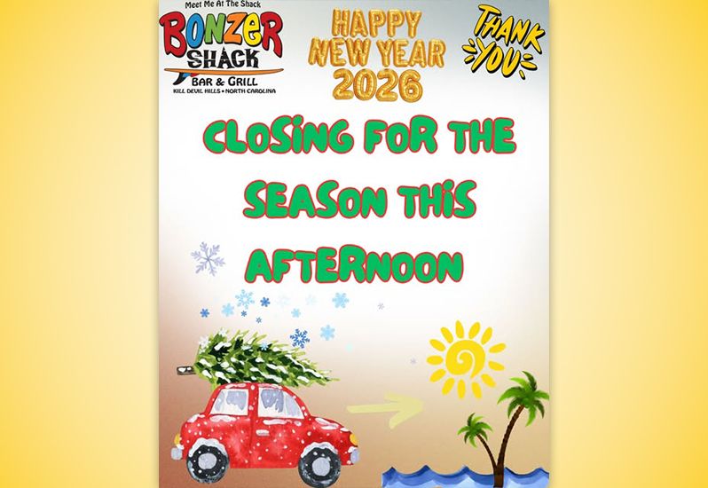 December 31 at 1:42pmThanks Everyone for the Great Year and Opportunity to Serve Y’all. We will reopen sometime early March! Visit Our WebsiteClick here for more posts from Bonzer Shack Bar & GrillBonzer Shack Bar & Grill 1200 S. Virginia Dare TrailKill Devil Hills(252) 480-1010Website DirectionsCall us