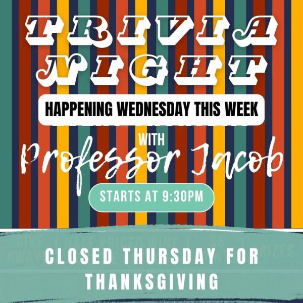 Trivia Night is happening TONIGHT this week! We'll be closed tomorrow for Thanksgiving, so come on out tonight and celebrate Thanksgiving Eve... See More