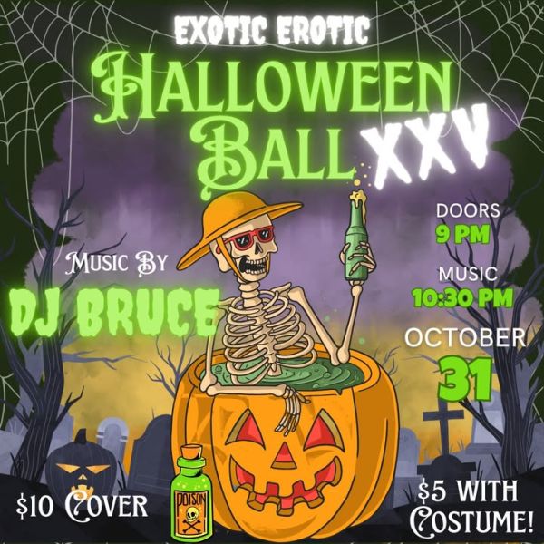 🎃✨ Join us for the 25th annual Exotic Erotic Halloween Ball with DJ Bruce on October 31st! Doors open at 9pm, music starts at 10:30pm. Dress to impress for a night of thrilling music and unforgettable fun. $10 cover ($5 with costume)! Don’t miss our annual costume contest with a $100 prize for each category: Exotic and Erotic! Get ready for the most enchanting night of the year! 🧙♀️👻