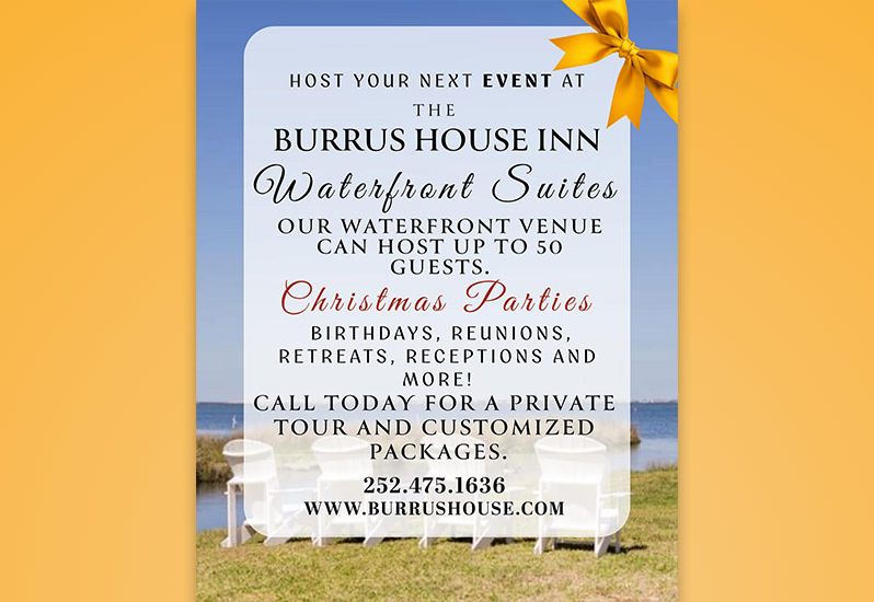 December 8 at 10:23amCall and book your event today! ๐ Visit Our WebsiteClick here for more posts from Burrus House Inn Waterfront SuitesBurrus House Inn Waterfront Suites 509 Highway 64Manteo(252) 475-1636Website DirectionsCall us