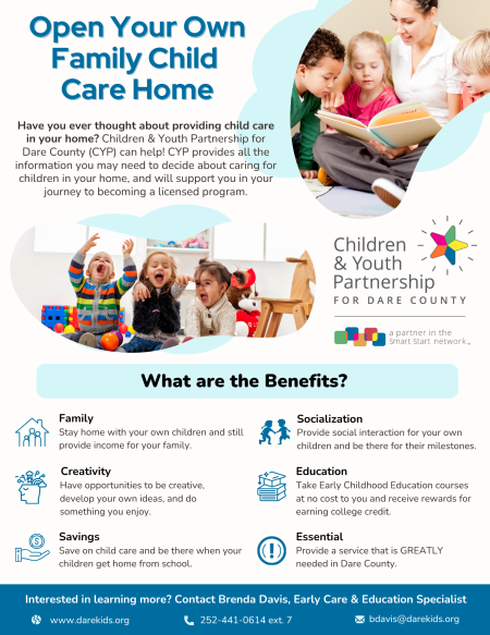 Have you ever thought about providing child care in your home? Children & Youth Partnership for Dare County can help!