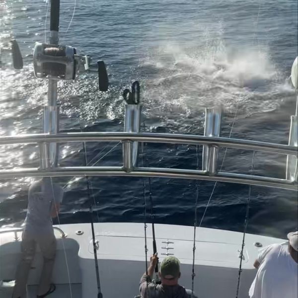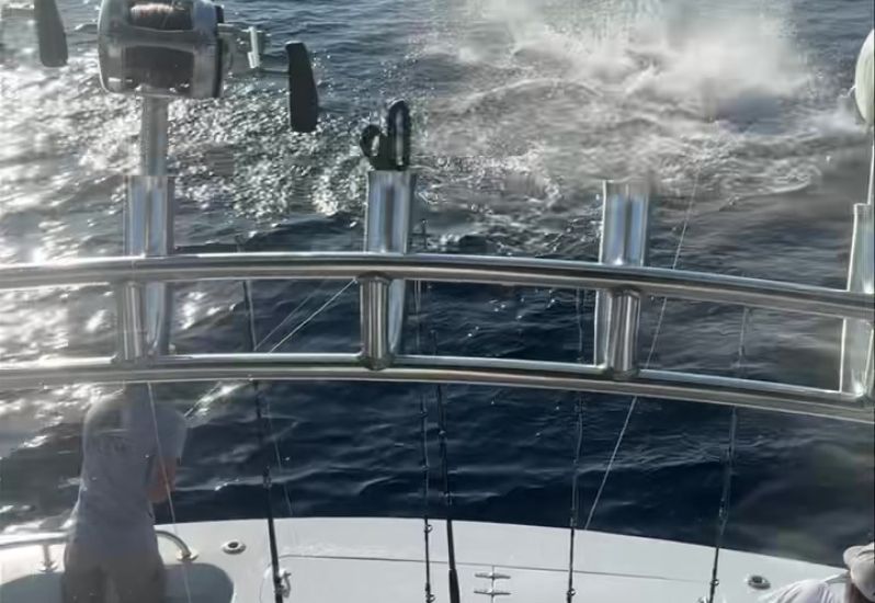 Caught a blue marlin early, and my son got his first shot at leadering one up. Did a descent job — and got a little reminder when the leader came back and popped him in the shoulder. Part of the deal.