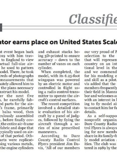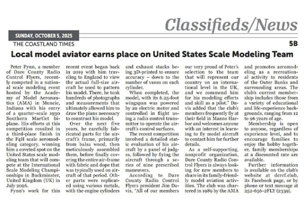 An article appeared in today's edition of The Coastland Times about club member Peter Fynn being selected as a member of the United States Scale Modeling Team that will compete in Buckminster, UK in July 2026. 🛩️