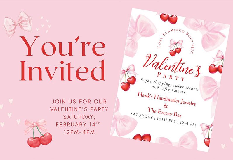 💗Join us for a charming Valentine's Day Party at Foxy Flamingo Boutique. Enjoy delicious refreshments from The Breezy Bar & find the perfect custom jewelry pieces from Hanks Handmades Jewelry, perfect for that special someone, or a treat for yourself. Don't forget to grab a sweet... See More