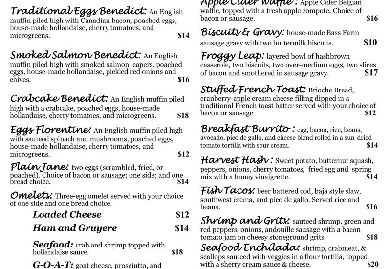 We are so excited to share our Fall 2025 Brunch Menu with everyone. Pumpkin Spice Pancakes are BACK, along with our apple-cider waffles and cranberry-apple stuffed French toast. Don't forget to try our harvest hash with fresh butternut squash or our new chicken fajita omelet. There is something for everyone. Brunch and lunch served 11 am-4 pm.