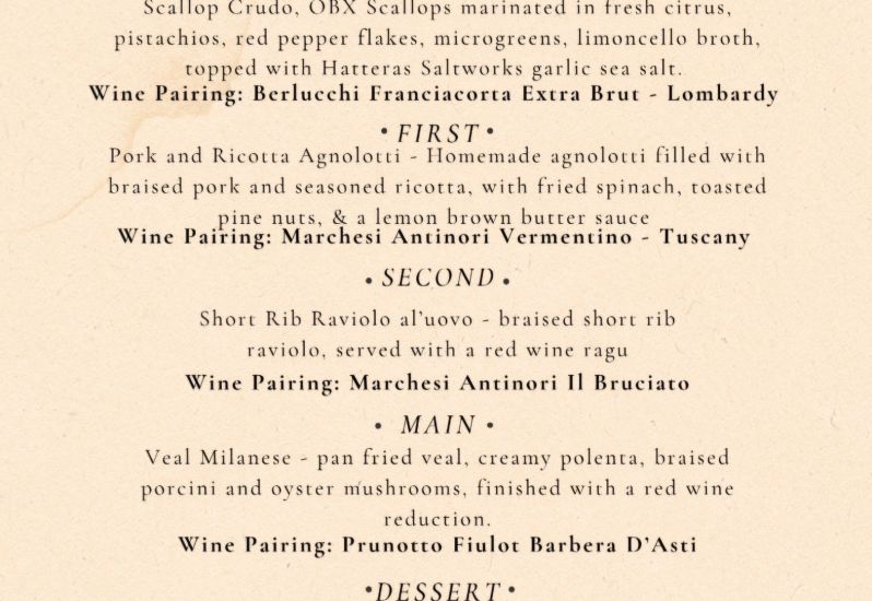 Our October Wine Dinner is only a week away, October 14th. We are excited to share the next menu. We are headed back to Italy and 3 of the 5 wine are from the Antinori family. It's going to be an amazing night. Unfortunately, we only have 2 seats still available for the 14th. Call to secure the last remaining seats today. $90 a person plus gratuity. Reservations can be made by calling (252) 995-5550.