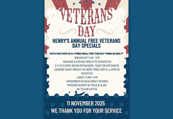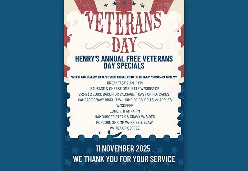 November 10 at 5:43pmThank you for your service! Click here for more posts from Henry's RestaurantHenry's Restaurant 3396 N Croatan HwyKill Devil Hills(252) 261-2025Website DirectionsCall us