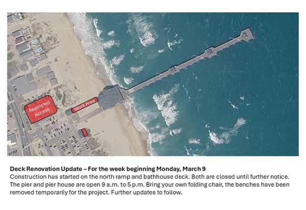 For the week beginning March 9th we will be doing construction on the north ramp and bathhouse deck. Both are closed until further notice. The pier and the pier house with both BE OPEN from 9am-5pm. Bring your own folding chair as the benches have been temporarily removed for the project.