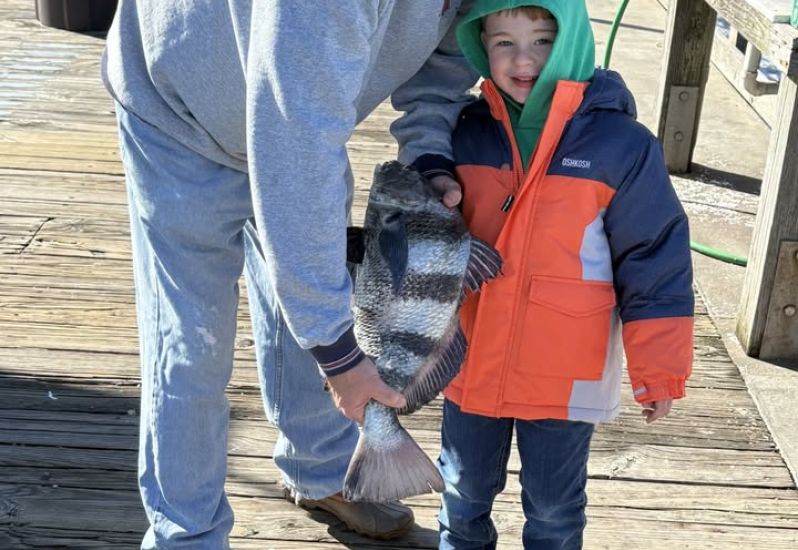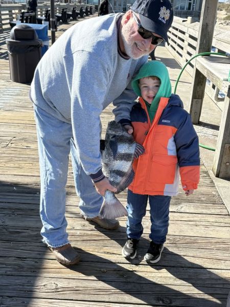 Sunny and Nice -- Walter Betterton, age 4 from Roanoke, Va. caught this nice BLACK DRUM while fishing with his grandpa. So far today, small BLUEFISH. There's a moderate N breeze at 12 knots. Ocean temp 58 degrees. High tides 9:30 a.m. and 9:55 p.m. Low tide 4:07 p.m. The pier's hours... See More