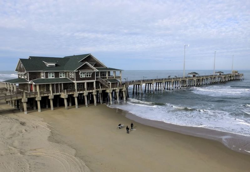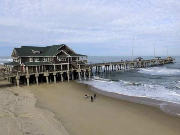 Several #surfers get set to hit the waves near the #pier. No one is fishing today. Winds are NW at 6 knots. #ocean water temp 36 degrees, air temp 52 degrees. Low tide 9:58 a.m. High tide 3:40 p.m. Photo by Meredith Fish.
