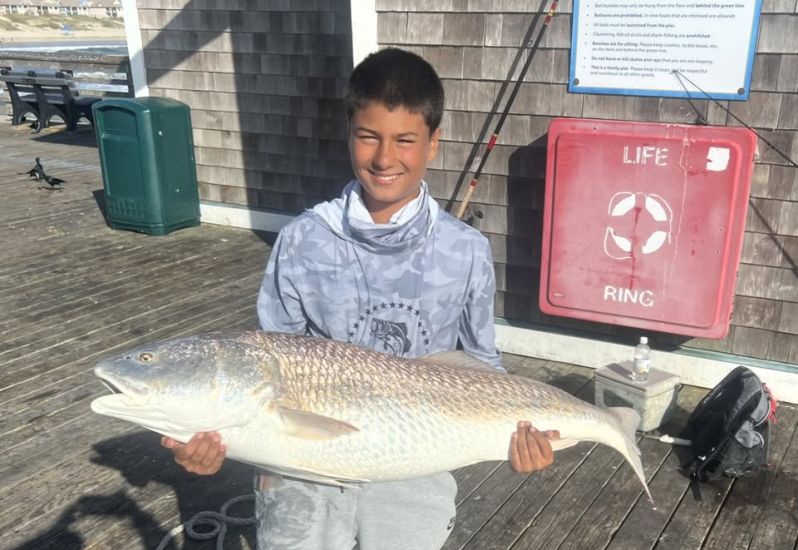 Another Big One -- Sean C., age 13 of Brooklyn, N.Y., caught his first ever big RED DRUM this morning on the end of the pier. His dad said they have been coming down to the "OBX" from Brooklyn for the last three years trying to catch a bull DRUM with no success until this morning. #Congrats