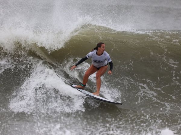 Wallace Wins -- Several large RED DRUM and a few BLUEFISH have been caught. The ESA Championships are wrapping up today. Overcast, wind WNW 10-15 mph. Still some small, clean swell, water temp 71. Low tide 11:40 a.m. High tide 6:00 p.m. Local gal Jessica Wallace takes first in Women's final yesterday!