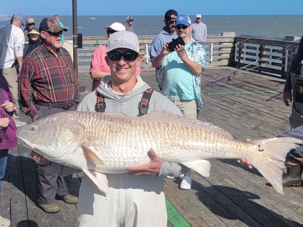 Big Bull -- Tripp Phillips of Manteo just caught and released this giant, 49 - inch RED DRUM while competing in the Outer Banks Association of Realtors fishing tournament, which moved to the piers due to difficult beach driving conditions, strong winds and heavy surf. He was fishing with his dad for Team Island Insurance.