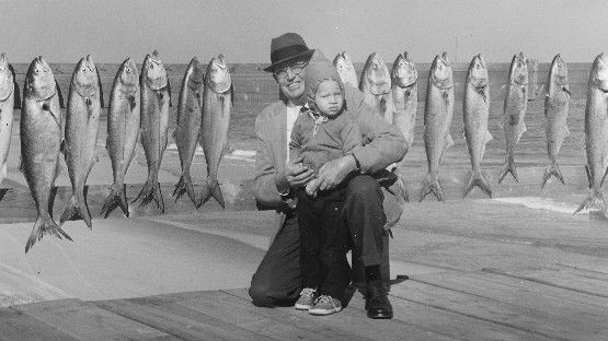 Throwback Thursday -- Quite a few anglers are giving it a go despite the strong, 22 knots NE breeze rolling in, kicking up the surf. So far, RED DRUM and BLUEFISH. Water temp 72 degrees, High tide 9:26 a.m. and 9:49 p.m. Low tide 3:59 p.m. Today's blast from the past photo shows a well dressed man with a boy and mess of large BLUEFISH.