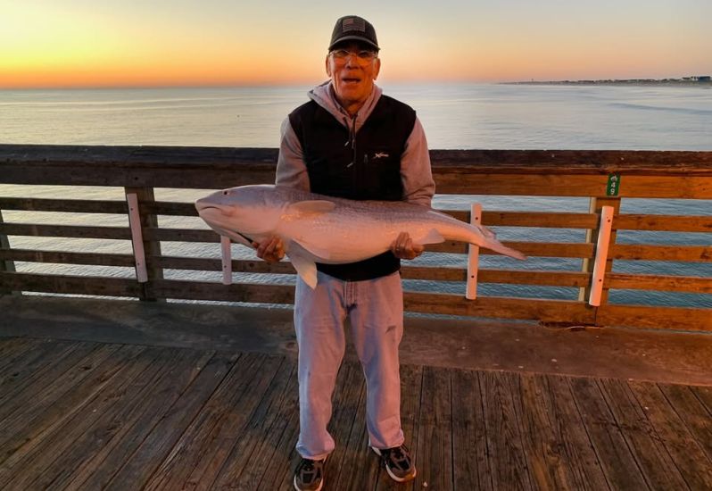 VIP Tourney Today -- Rick Probst, pictured, caught and released this beautiful 42-inch RED DRUM at day break. Anglers are also catching small SPECKLED TROUT, BLUEFISH, FLOUNDER and SEA MULLET. Water temp 65 and winds are SW at 5 to 10 mph. High tide 7:57 a.m. and 8:08 p.m. Low 2:22 p.m.