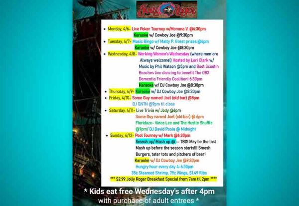 11 hours agoCheck out what's happening at the JoRo this week! π΅π€π»π¦π Check out what's happening at the JoRo this week! π΅π€π»π¦π Check out what's happening at the JoRo this week! π΅π€π»π¦π See April Calendar of EventsClick here for more posts from Jolly Roger RestaurantJolly Roger Restaurant 1836 North Virginia Dare TrailKill Devil Hills(252) 441-6530Website DirectionsCall us