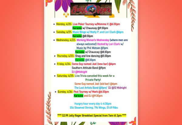 April 20 at 10:14amCome see us this week! ⛱️ Visit Our WebsiteClick here for more posts from Jolly Roger RestaurantJolly Roger Restaurant 1836 North Virginia Dare TrailKill Devil Hills(252) 441-6530Website DirectionsCall us