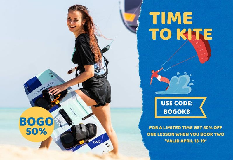 Book with a friend and save! BOGO 50% on all Kiteboarding lessons. Please Call 252-987-2297 EXT.1 For More Information. Valid April 13-19, 2026.