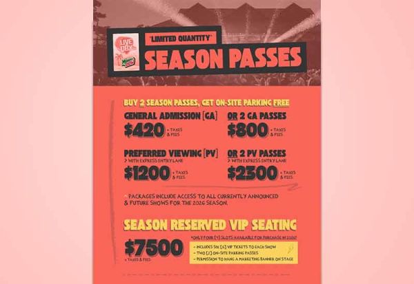 Season passes are now available in limited quantity. Each pass includes access to every currently announced show and any additional shows added to the 2026 season.