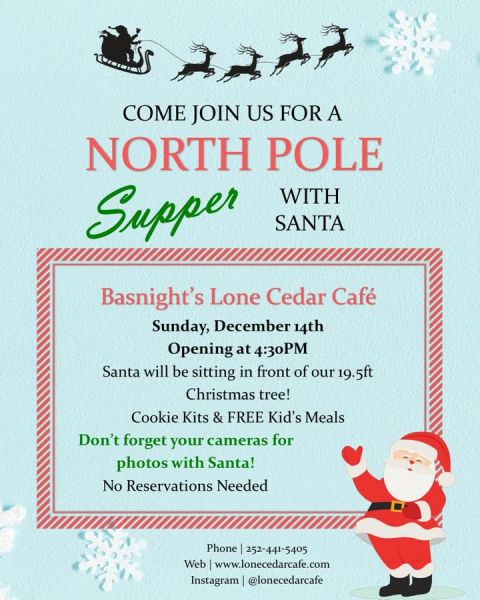 November 13 at 11:38am via Make plans to join us & Santa on December 14th🎅 Click here for more posts from Basnight’s Lone Cedar CafeBasnight’s Lone Cedar Cafe 7623 S Virginia Dare TrNags Head(252) 441-5405Website DirectionsCall us