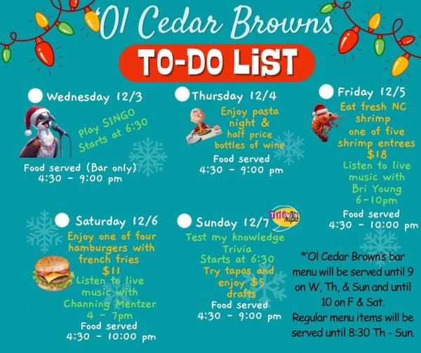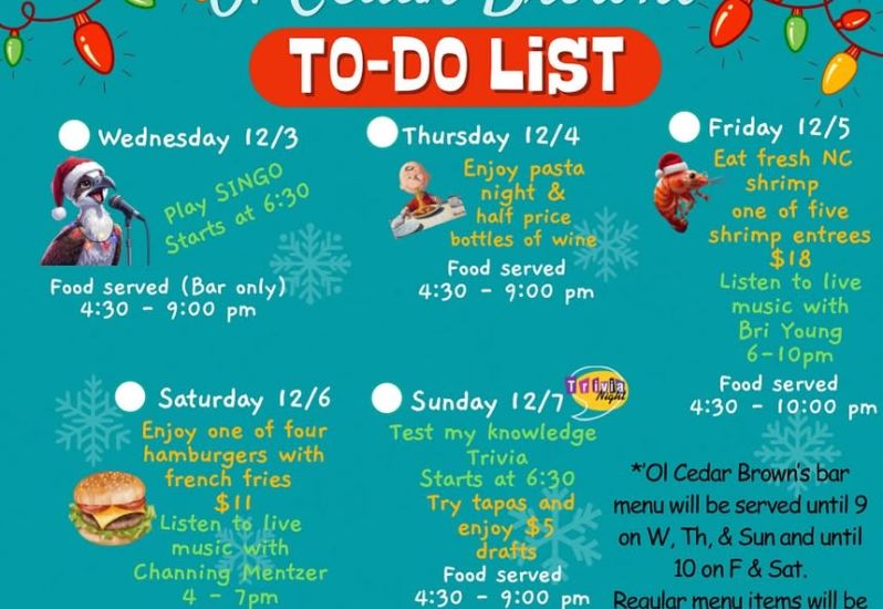 3 hours ago via ‘Ol Cedar Brown’s is wide open until 10pm tonight!! Get in here and grab your passport🎄 @the12barsofchristmas Click here for more posts from Basnight’s Lone Cedar CafeBasnight’s Lone Cedar Cafe 7623 S Virginia Dare TrNags Head(252) 441-5405Website DirectionsCall us