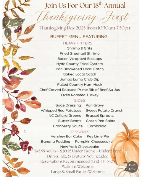 November 7 at 8:32am via We have a few reservations left, but walk-ins are welcome. We hope to see you all on Thanksgiving.🦃 Click here for more posts from Basnight’s Lone Cedar CafeBasnight’s Lone Cedar Cafe 7623 S Virginia Dare TrNags Head(252) 441-5405Website DirectionsCall us