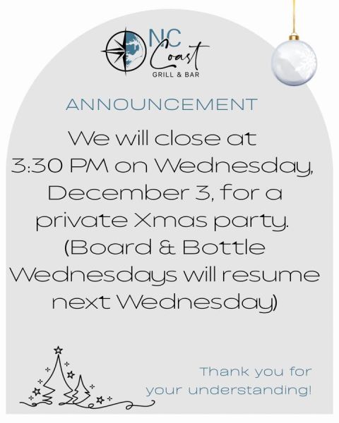 November 29 at 6:30pm via Click here for more posts from NC Coast Grill & BarNC Coast Grill & Bar 1184 Duck RoadKitty Hawk(252) 248-3211Website DirectionsCall us
