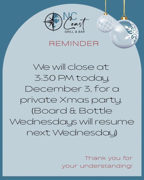 December 3 at 9:00am via Click here for more posts from NC Coast Grill & BarNC Coast Grill & Bar 1184 Duck RoadKitty Hawk(252) 248-3211Website DirectionsCall us