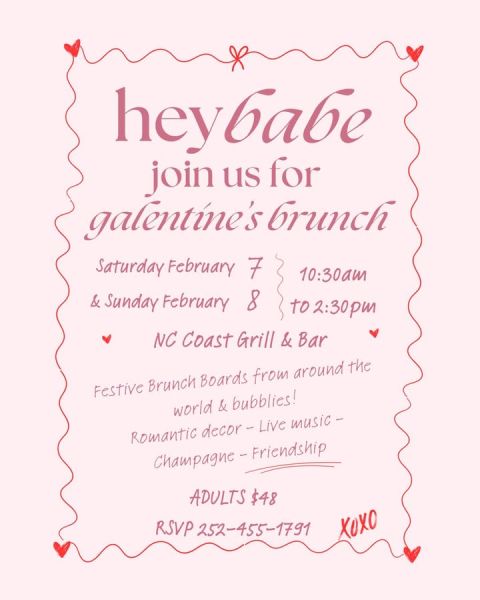 Due to popular demand, we have added Saturday, February 7 to our Galentine’s Brunch weekend! Sunday is almost sold out! RSVP 252-455-1791