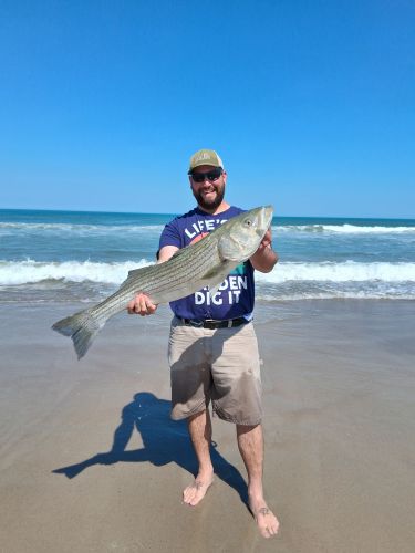 The King has struck again!! AJ from Vermont is just tearing it up this week. When I posted his first drum a couple of days ago, I called it good old beginner's luck, but now he's just showing off. The next day, a 21" black drum, and he was in the store early this morning, and then went out and caught a 38" striper of all things. Now, this is his first time in the Outer Banks, but I have a funny feeling we will see him again. AJ, you have certainly earned the title of King of the week and quite possibly King of season 2026th. We also had a call into the shop from a couple of anglers who loaded up yesterday, and they reported getting two black drum this morning, a 22" and a 23" on sand flea and fish bites. Most anglers are using cut-up mullet. The water is clean and clear today with 1 to 2 foot waves, and we expect more of the same tomorrow before we get that incoming rain Saturday and Sunday. The water temp did cool off, we had hit 60 degrees finally, but we are sitting at 57 for today, and it seems the fish don't mind it. Other than some of the larger catches, we do see some really good-sized mullet along with croakers, skate, and dogfish this week. I am starting to see some big bluefish caught to the south of here, so with any luck, they are on their way. I have had no reports of any blues up here getting caught thus far, so they seem to be a little behind schedule.