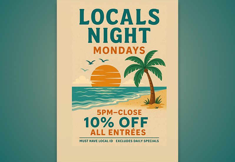 Monday perks for our local friends! Begin your week with a 10% discount on entrees! Offer starts at 5! Excludes daily specials and alcohol!