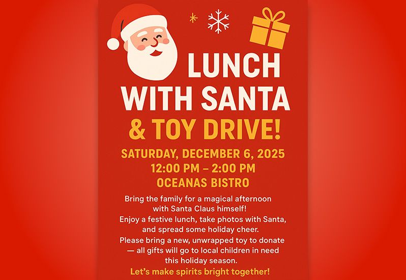 Enjoy a festive lunch, take photos with Santa, and spread some holiday cheer. Please bring a new, unwrapped toy to donate. All gifts will go to local children in need this holiday season. Let's make spirits bright together!