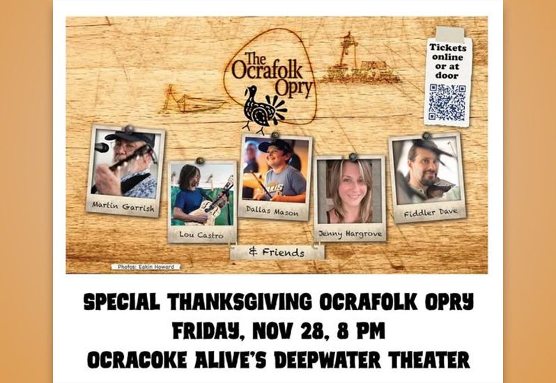 Join us for the final Ocrafolk Opry of 2025, our special Thanksgiving show, Friday, Nov 28, 8 PM at Ocracoke Alive’s Deepwater Theater.