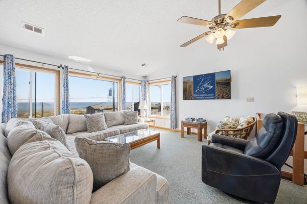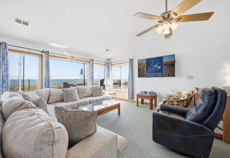 Babe’s Place is a semi-oceanfront Kill Devil Hills retreat with classic Outer Banks charm, offering unobstructed water views, a spacious top-level deck, and five bedrooms accommodating multiple families. With three living areas, multiple kitchens, and a walkable location near Avalon Pier and local shops, it combines flexibility, comfort, and convenience for a relaxed beach vacation!🏖