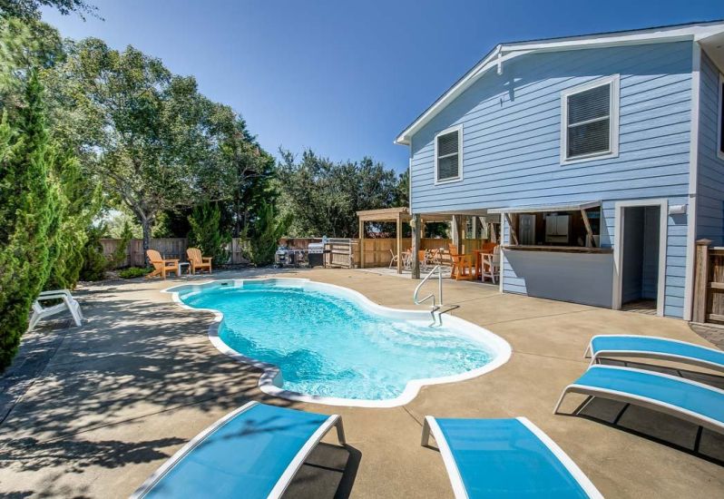 Let’s Do Sunset is a pet-friendly, 3-bedroom soundside home in Kill Devil Hills featuring a private pool, rooftop deck, comfortable outdoor seating, and availability for both weekly and partial-week stays✨