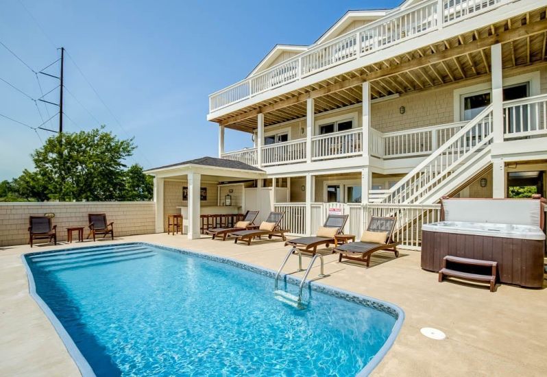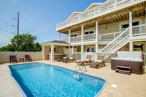 Sea La Vie is a 7 bedroom, soundfront, Kitty Hawk home in the gated community, First Flight Ridge. The home offers stunning views of Kitty Hawk Bay, a private pool, hot tub, and pool table!🌅