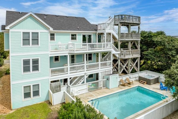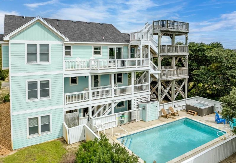 A Shore Pleasure is an 8 bedroom, oceanside home in Corolla that offers a private pool, hot tub, beach gear credit, pool table, and more. Being in the Whalehead neighborhood, you're close by grocery stores, local shops, and the Bonito St beach access!๐
