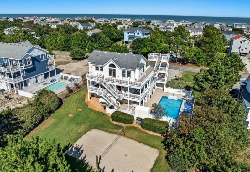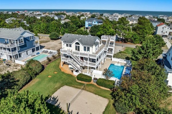 Fun in Paradise is an 8 bedroom, ocean side, dog-friendly home in Corolla that offers a private pool, beach gear credit, hot tub, volleyball court, pool table and more. Upgrades for 2026 include new wood laminate flooring on all levels, all six interior bathrooms... See More