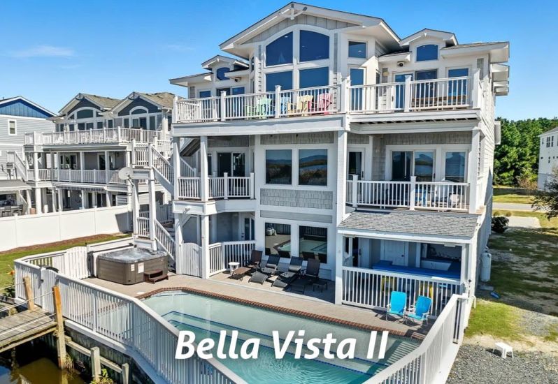 Bella Vista II is a luxurious soundfront retreat in Corolla’s Cruz Bay neighborhood, offering seven master bedrooms, multiple gathering spaces, and panoramic sunset views from every level. Guests can enjoy top-tier amenities including a private pool and hot tub, a game and theater room, elevator access, and a private pier for relaxing waterfront moments!🌅