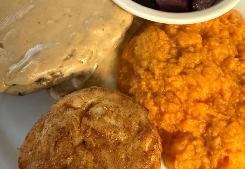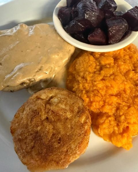 Can’t beat a Pork Chop with Sweet Onion Gravy & a NC Jumbo Lump Crabcake paired with Beets & Whipped Sweets #localseafood