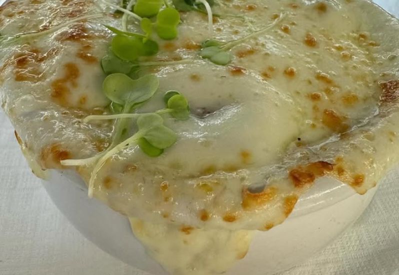 French Onion on a rainy evening! Swipe for yummy Tapas & Dinner Specials!! #waterfrontdining #frenchonionsoup