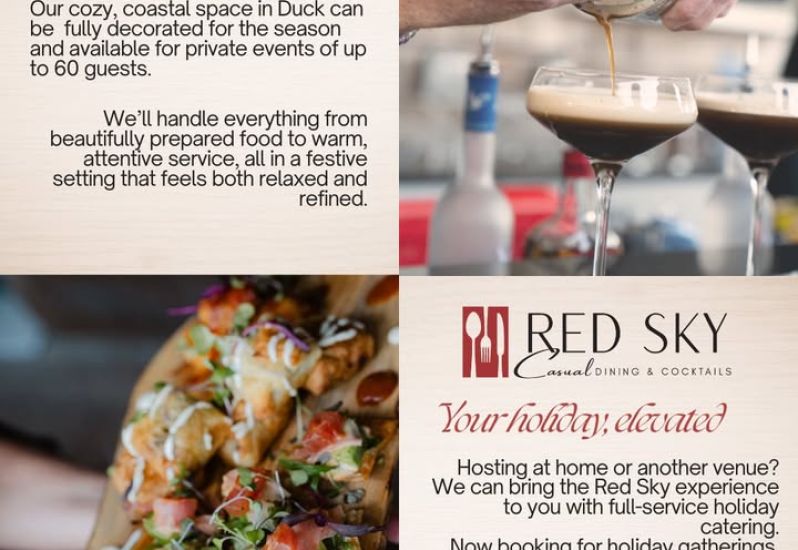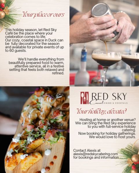 November 30 at 6:21pm via Your place or ours. Click here for more posts from Red Sky Casual Dining & CocktailsRed Sky Casual Dining & Cocktails 1197 Duck RdDuck(252) 261-8646Website DirectionsCall us