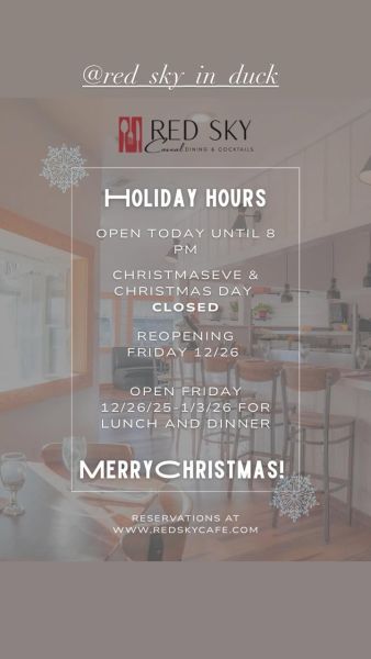 December 23 at 4:05pm via Click here for more posts from Red Sky Casual Dining & CocktailsRed Sky Casual Dining & Cocktails 1197 Duck RdDuck(252) 261-8646Website DirectionsCall us