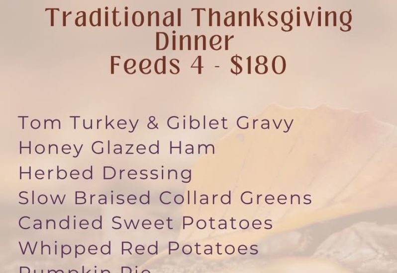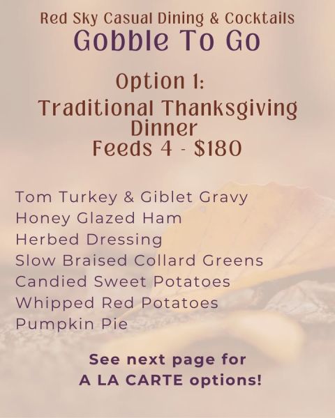 Pickup: Wednesday, Nov 26 (11am–4pm) or Thursday, Nov 27 (9am–1p) at Red Sky Casual Dining & Cocktails in Duck!