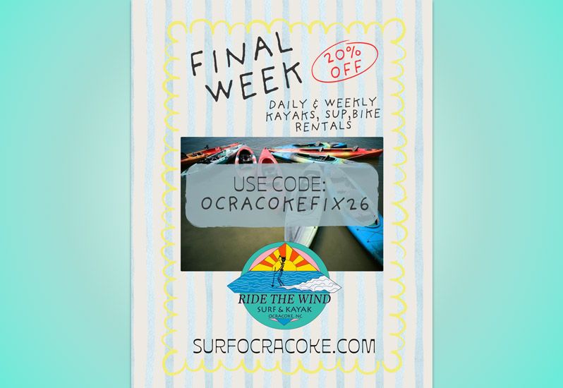 This is the last week to book ahead and get 20% off all daily & weekly rentals of kayaks, stand up paddle boards, and bikes when you use promo code “OCRACOKEFIX26”